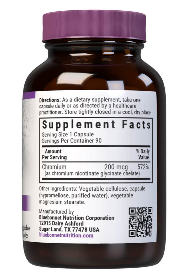 Bluebonnet's Albion Yeast-Free Chelated Chromium Capsules provide 200 mcg of elemental chromium from fully reacted chromium nicotinate glycinate, an amino acid chelate mineral from Albion. Available in easy-to-swallow vegetable capsules for maximum assimilation and absorption.
