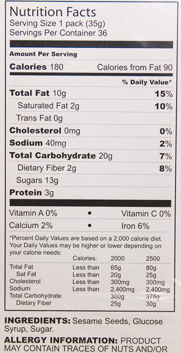 Sesame Seeds, Glucose Syrup, Sugar. UPC Code: 872590000193