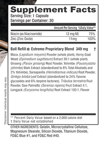 Take one (1) Ball Refill capsule daily 30-45 minutes prior to sexual activity, but still take it daily if no activity. Ball Refill works to increase male sexual performance by enhancing male volume. UPC Code: 705105237206