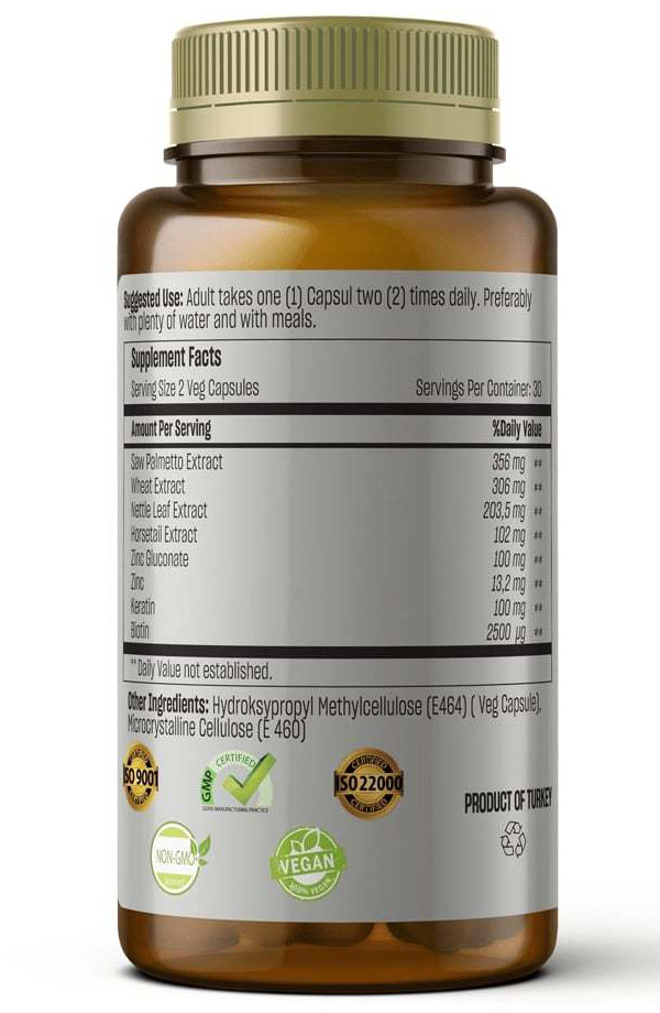 This special Meditarrenean blend, which includes saw palmetto extract,wheat extract, nettle leaf extract, horsetail extract, zinc and keratin, helps maintain healthy hair, skin and nails by promoting inner health.