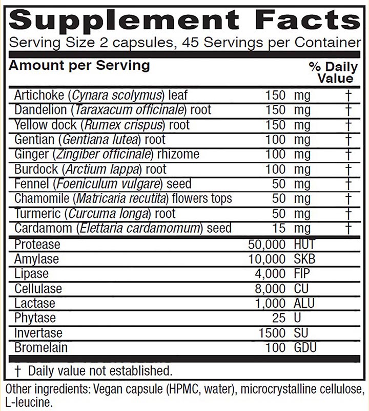 Traditional bitter herbs promote healthy digestion. Includes a full complement of plant-based digestive enzymes to support digestive functions more fully - in a convenient, easy to take capsule.