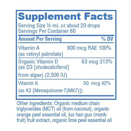 Vitamin A (Retinyl Palmitate 3,000 IU), Vitamin D3 (VegD3 Cholecalciferol from organic algae, 2,500 IU), Vitamin K2 (K2Vital all trans menaquinone MK-7), organic MCT oil (coconut derived), luo han guo (monk fruit) extract, organic orange and lime peel essential oil.