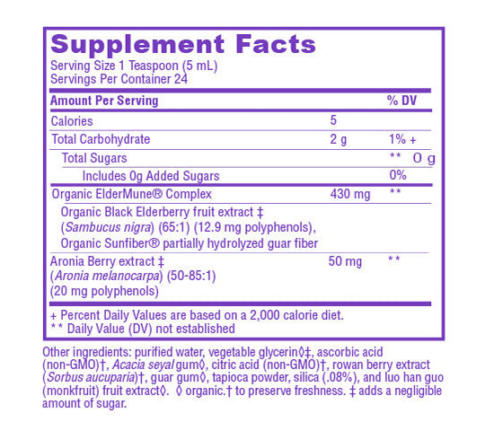 Organic ElderMune Black Elderberry fruit extract (Sambucus nigra), ascorbic acid (non-GMO), Aronia Berry (Aronia melanocarpa) extract, purified water, organic vegetable glycerin, organic partially hydrolyzed guar fiber, organic Acacia seyal gum, citric acid (non-GMO), Rowan berry extract (Sorbus aucuparia), organic guar gum, tapioca powder, silica (.08%), and luo han guo (monk fruit) extract.