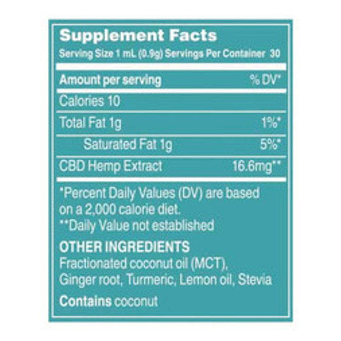 MCT Coconut Oil, CBD Hemp Extract, Lemon Essential Oil, Ginger Root, Turmeric, Stevia *Contains Coconut*