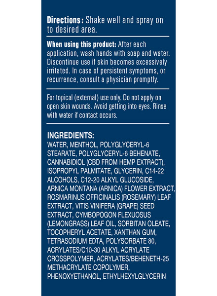 Level 2 CBD Sports Spray is formulated with high potency CBD and cooling menthol for fast-acting, long-lasting relief. This dual action Sports Spray is designed to dry instantly for hands free, no mess application. Level 2 Extra Strength for higher levels of relief. UPC Code: 810026410580