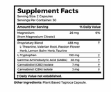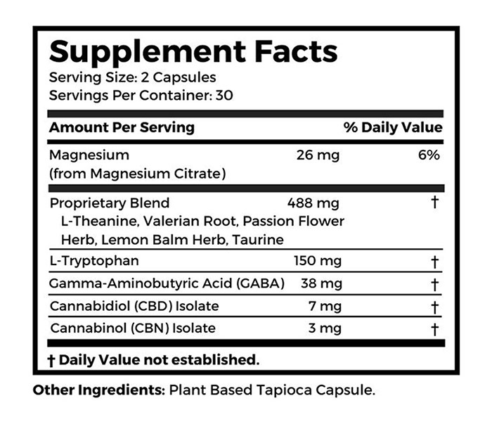Magnesium (from Magnesium Citrate), L-Theanine, Valerian Root, Passion Flower Herb, Lemon Balm Herb, Taurine, GABA (Gamma-Aminobutyric Acid), L-tryptophan, Cannabidiol (CBD) Isolate (from Hemp), Cannabinol (CBN) Isolate (from Hemp), Plant-Based Tapioca Capsule.