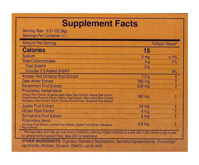 Korean Red Ginseng Root Extract, Deer Antler Extract, Persimmon Fruit Extract, Proprietary Herbal Blend (Chinese Peony Root Extract, Angelica gigas Nakai Root Extract, Cassia Bark Extract, Bai-zhu Atractylodes Rhizome Extract, Chinese Licorice Root Extract, Rehmannia Root Extract, Astragalus Root Extract, Marsh Parsley Root Extract, Tangerine Peel Extract), Jujube Frit Extract, Ginger Root Extract, Schisandra Fruit Extract, Proprietary Blend (Chinese Skullcap Root Extract, Chinese Licorice Root Extract, Jujube Fruit Extract, Astragalus Root Extract).