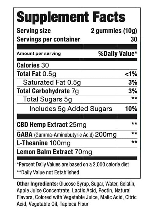 - 25 mg of Broad Spectrum CBD, 200 mg of GABA, 100 mg of L-Theanine, and 70 mg of Lemon Balm Per Serving.