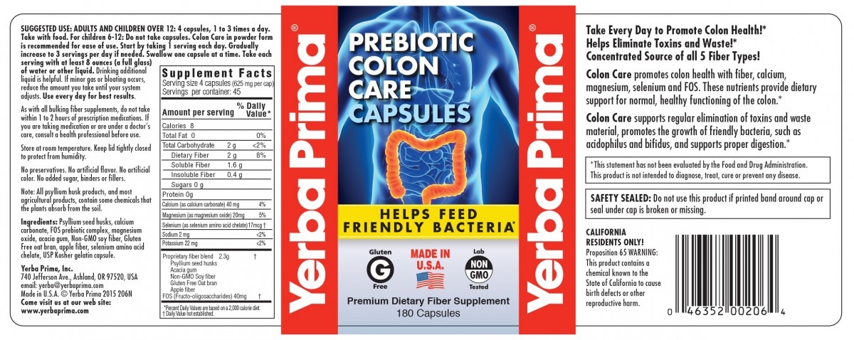 Prebiotic Colon Care Caps promotes colon health with fiber, calcium, magnesium, selenium and FOS prebiotic growth complex. These nutrients provide dietary support for normal, healthy functioning of the colon, including regular elimination of toxins and waste material, promoting the growth of friendly bacteria, such as acidophilus and bifidus, and support for proper digestion.
