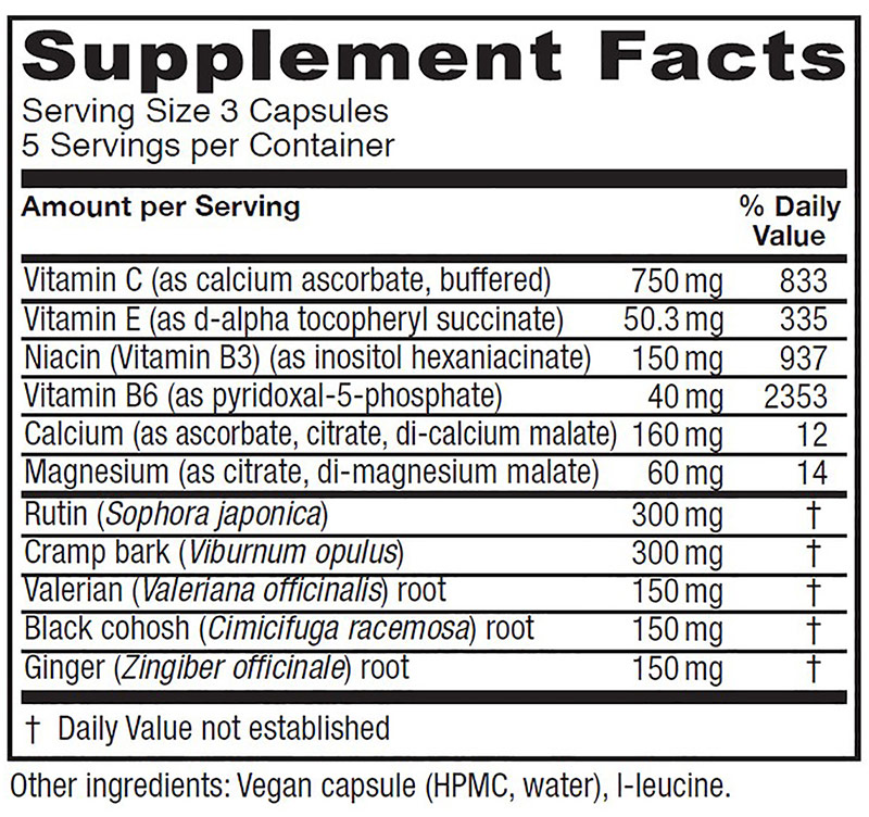 Temporary support, 1-3 capsules every three hours; up to four times daily during menstruation. A maintenance dose of 3 capsules, once daily may be taken 1-2 days before menstruation. The maintenance dose may also be taken as needed to support muscle tissue relaxation anywhere in the body; also suitable for men. UPC Code: 708118020261