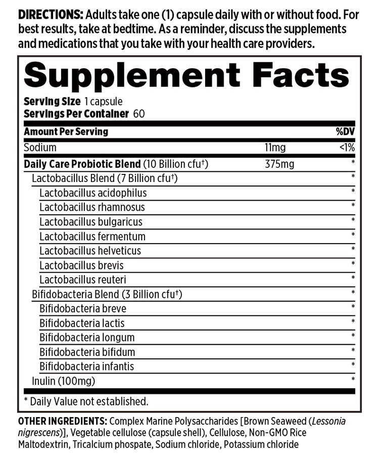 Adults can take one capsule daily with or without food to help support digestive health. For best results, take Daily Care Probiotic at bedtime. There's no need to refrigerate after opening, as these are shelf-stable. It's always best to collaborate with a healthcare provider when taking any supplements or medications. UPC Code: 855757003411