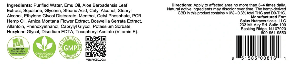 Purified Water, Emu Oil, Aloe Barbadensis Leaf Extract, Squalane, Glycerin, Stearic Acid, Cetyl Alcohol, Stearyl Alcohol, Ethylene Glycol Distearate, Menthol, Cetyl Phosphate, PCR Hemp Oil, Arnica Montana Flower Extract, Boswellia Serrata Extract, Allantoin, Phenoxyethanol, Caprylyl Glycol, Potassium Sorbate, Hexylene Glycol, Disodium EDTA, Tocopheryl Acetate (Vitamin E). UPC Code: 851585008161