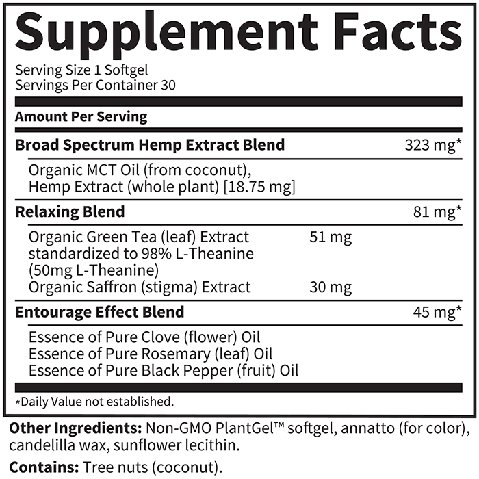 Hemp+ Relax softgels delivers 18.75mg Whole Hemp Extract (per serving) along with 51mg L-Theanine from Organic Green Tea Extract (98%) and 30mg Organic Saffron. Dr. Perlmutter included L- Theanine as it promotes relaxation and facilitates sleep by contributing to a number of changes in the brain. A clinically studied dose of 30mg of Saffron was also included to help improve mood and reduce anxiety and stress.