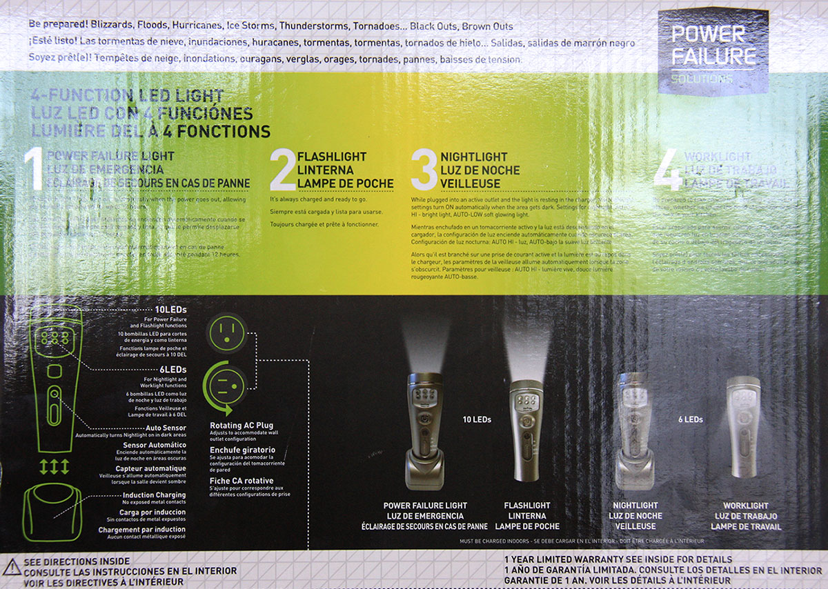 4 Function LED Lights (Power Failure Light, Nightlight, Worklight, Flashlight) |