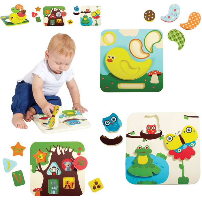 10" square Edu-Foam puzzle features a tree of happy creatures all waiting to be fed with the matching food pieces. Encourages logic and reasoning skills, and shape matching!