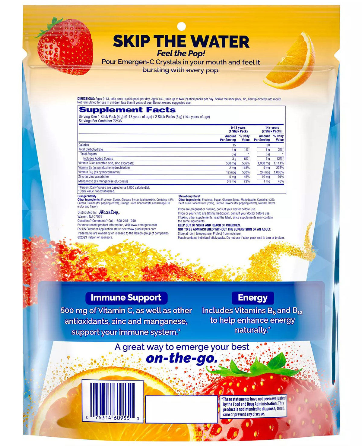 Emergen-C Crystals offer the same great Emergen-C immune support in a convenient, no-water-needed crystal popping experience. For daily immune support, simply open the dietary supplement stick pack, pour the crystals in your mouth, and feel the popping - no water or mixing needed. This pack contains 72 Emergen-C vitamin C with zinc stick packs.