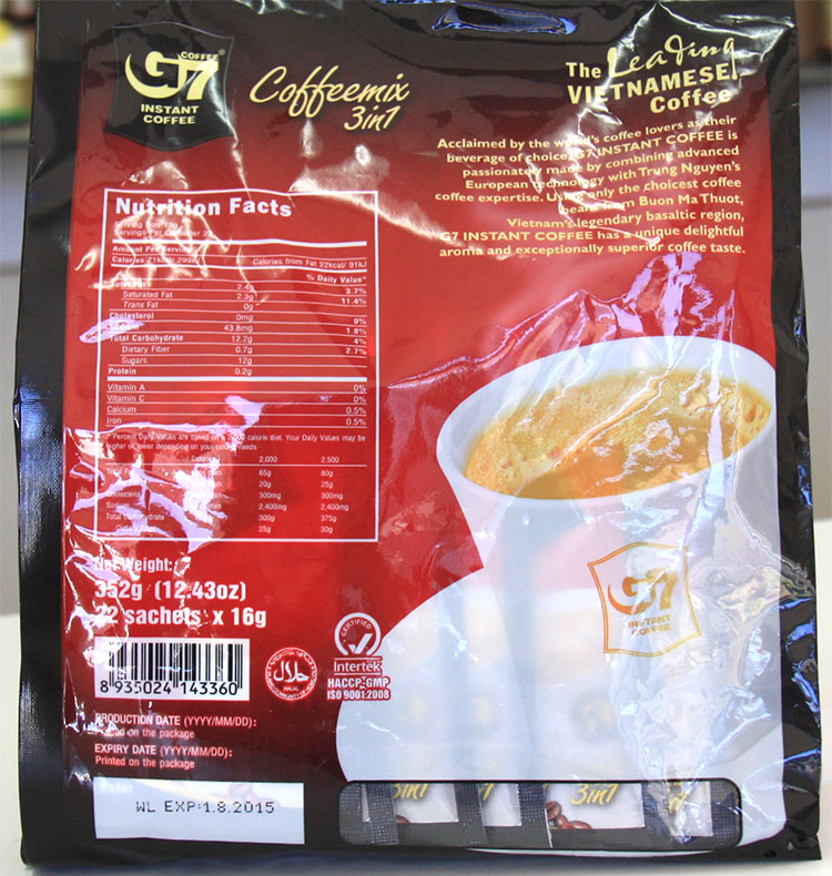 G7 is the world's best-tasting (never bitter) gourmet instant coffee, famous throughout Southeast Asia. The 3-in-1 contains coffee, non-dairy creamer and 8 grams sugar per serving. Just add 6 oz. hot water and stir for gourmet coffee anywhere - at home, in hotels, camping, at work, etc..