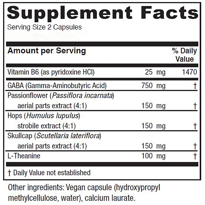 GABA and L-theanine are two of our best nutrients researched for their promotion of calming effects. Passion flower, skullcap, and hops have generations of traditional use in herbal medicine for their calming and nerve tonic support. This formula is an important combination of the results of modern science in natural medicine and the decades of experience in herbal medicine to promote a calming effect during occasional stress, nervous tension, and hormonal irritability.