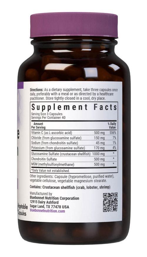 Bluebonnet's Glucosamine Chondroitin Plus MSM Capsules provide a potent, synergistic blend of joint-supporting nutrients per serving, such as: pure glucosamine sulfate (1000 mg), chondroitin sulfate (500 mg) and OptiMSM (500 mg), a superior active form of sulphur plus 500 mg of vitamin C from L-ascorbic acid. Available in easy-to-swallow vegetable capsules for maximum assimilation and absorption.
