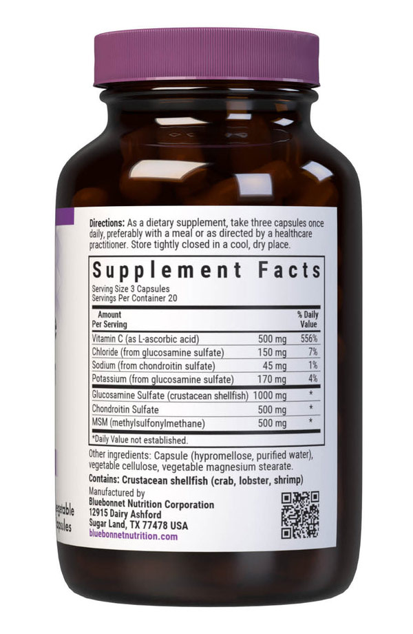 Bluebonnet's Glucosamine Chondroitin Plus MSM Capsules provide a potent, synergistic blend of joint-supporting nutrients per serving, such as: pure glucosamine sulfate (1000 mg), chondroitin sulfate (500 mg) and OptiMSM (500 mg), a superior active form of sulphur plus 500 mg of vitamin C from L-ascorbic acid. Available in easy-to-swallow vegetable capsules for maximum assimilation and absorption.