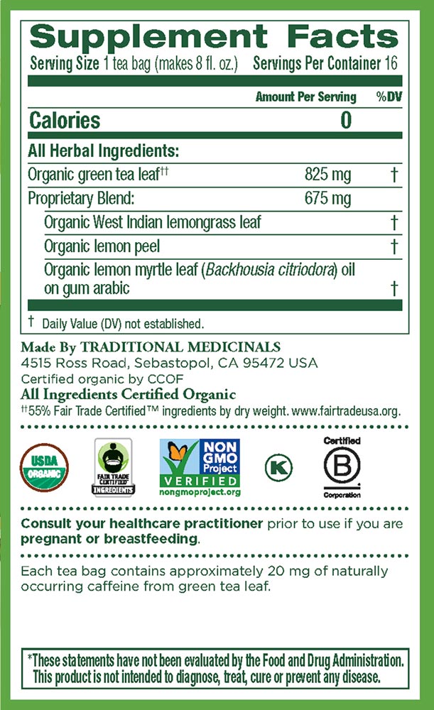 Notice: Individual results may vary. You should always consult with your physician before starting this product or any health-related program. Disclaimer: The product descriptions and the statements on this page are from manufacturers and/or distributors and have not been evaluated by VitaSprings or the FDA. These products are not intended to diagnose, treat, cure, or prevent any disease. VitaSprings does not imply any medical claims from the customer reviews on this Organic Green Tea Lemongrass product on this website. © Traditional Medicinals Teas