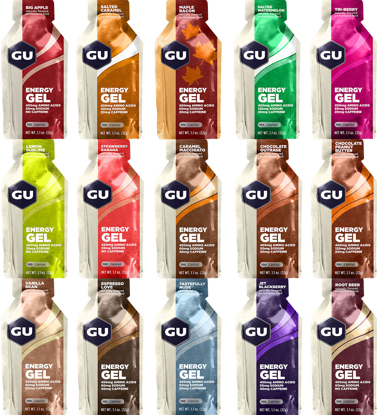 Created for daily training and competition, GU Energy Gel packs energy-dense calories in a portable packet to help sustain energy demands of any duration or activity. The 100-calorie packet contains carbohydrates (maltodextrin and fructose) that use non-competing pathways to help maximize carbohydrate absorption and utilization while diminishing stomach distress. The primary electrolyte (sodium) aids in hydration by maintaining water balance. The branched-chain amino acids (leucine, valine, isoleucine) may reduce mental fatigue and decrease muscle damage.