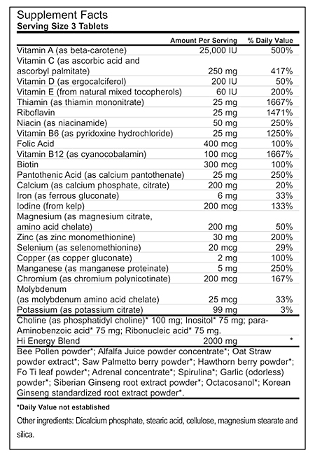 Hi Energy Multi for Men is fortified with vitamins, minerals, herbs and nutrients to support optimal health, energy, and protection. Daily super-nutrient complex for well-being, vitality and energy. Hi Energy Multi is the comprehensive multi vitamin for men that provides the vitamin-nutrient complex you need to work and feel your best.