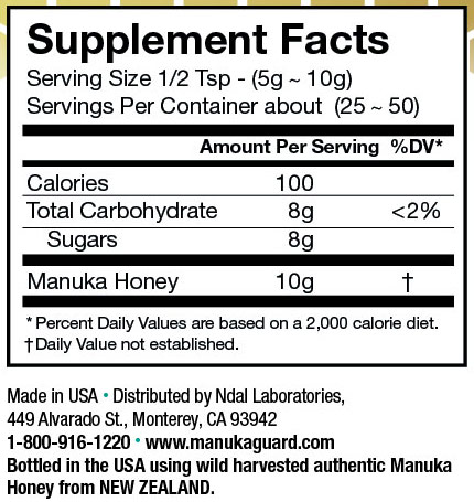 Notice: Individual results may vary. You should always consult with your physician before starting this product or any health-related program. Disclaimer: The product descriptions and the statements on this page are from manufacturers and/or distributors and have not been evaluated by VitaSprings or the FDA. These products are not intended to diagnose, treat, cure, or prevent any disease. VitaSprings does not imply any medical claims from the customer reviews on this Immune Builder Manuka Honey, MGO 100 product on this website. © ManukaGuard