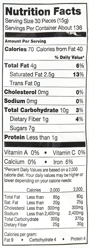 Chocolate Liquor, Sugar, Soy Lecithin (an emulsifier) and Vanilla. UPC Code: 096619473809