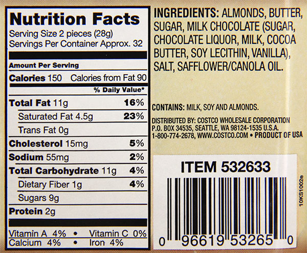 Almonds, Butter, Sugar, Milk Chocolate (Sugar, Chocolate Liquor, Milk, Cocoa Butter, Soy Lecithin, Vanilla), Salt, Safflower/Canola Oil. UPC Code: 096619532650