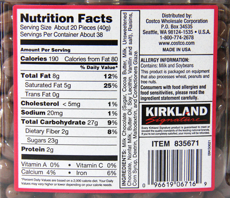 Notice: Individual results may vary. You should always consult with your physician before starting this product or any health-related program. Disclaimer: The product descriptions and the statements on this page are from manufacturers and/or distributors and have not been evaluated by VitaSprings or the FDA. These products are not intended to diagnose, treat, cure, or prevent any disease. VitaSprings does not imply any medical claims from the customer reviews on this Milk Chocolate Raisins product on this website. © Kirkland Signature