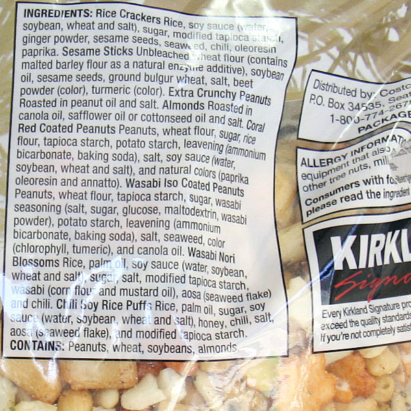 They should call this product "NUTS with Rice Crackers"...I am addicted to Asian Rice Crackers...but I do not like the Kirkland version. I like "Nutty Guys" version best....Oddly, Nutty Guys version does NOT contain any nuts! And I will not buy the Costco version again. I can't stand the vinegar, the wasabi balls, and the nuts.