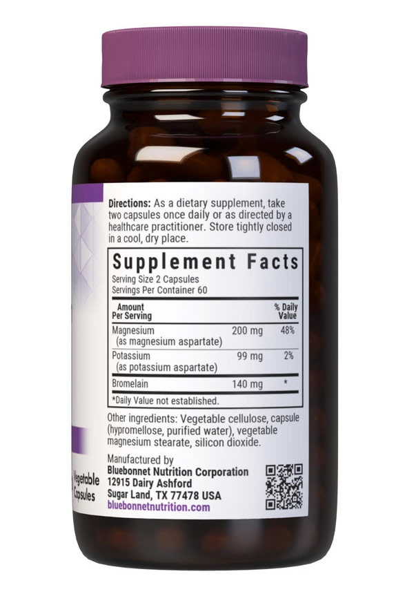 Bluebonnet's Magnesium Potassium Plus Bromelain Capsules provide chelated magnesium aspartate and chelated potassium aspartate, plus bromelain from fresh pineapples, providing 2000 GDU/gram. Available in an easy-to-swallow vegetable capsules for maximum assimilation and absorption.