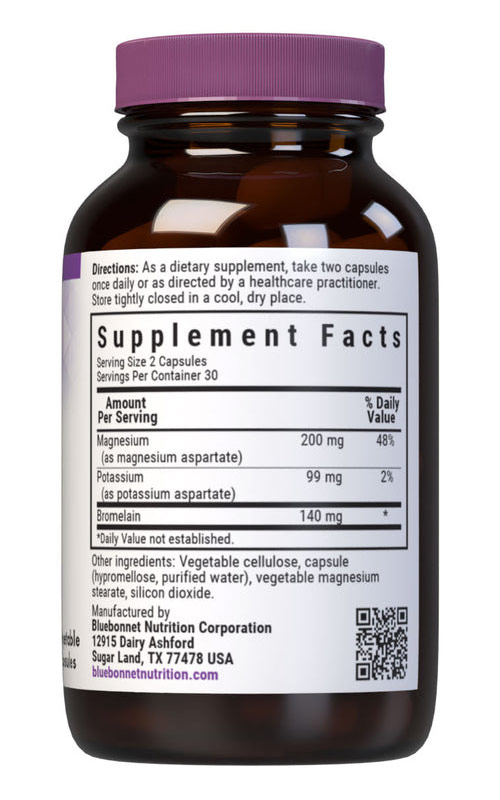 Bluebonnet's Magnesium Potassium Plus Bromelain Capsules provide chelated magnesium aspartate and chelated potassium aspartate, plus bromelain from fresh pineapples, providing 2000 GDU/gram. Available in an easy-to-swallow vegetable capsules for maximum assimilation and absorption.