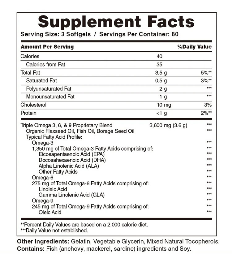 Triple Omega 3-6-9 features a comprehensive blend of nutritional oils - Fish, Flax, Borage and Evening Primrose - to contribute to heart, cardiovascular and joint wellness. The fish oil is a concentrated and highly-purified fish oil selected from the finest deep sea, cold water fish in order to provide the highest quality source.