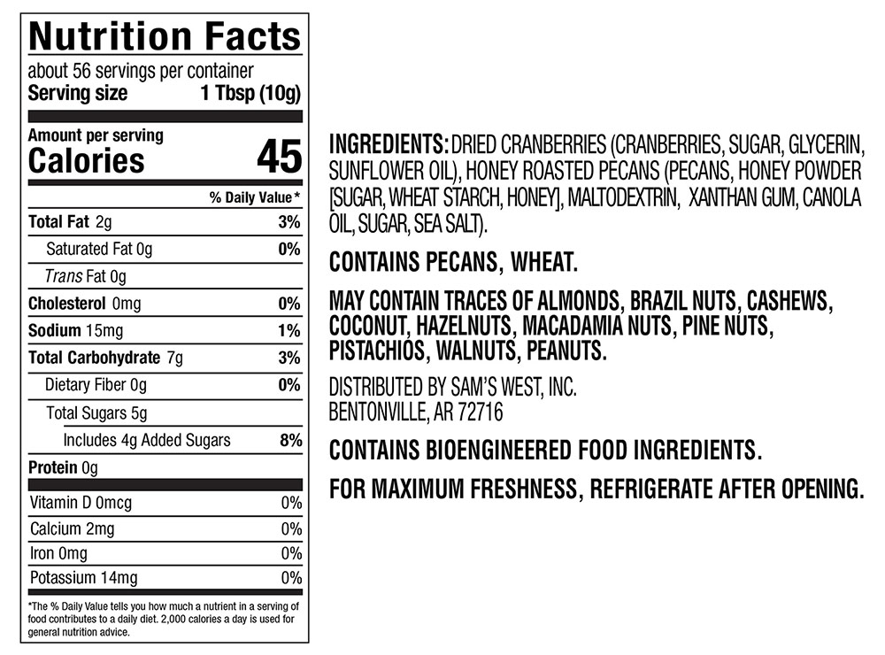 Member's Mark Cranberry and Pecan Salad Topping is a delicious mix of Dried and Sweet Cranberries with Honey Roasted Pecans. This versatile topping will give a flavor boost to all your favorite salads, morning oatmeal, yogurt, cereal and more. The sweetness of the cranberries and crunch of the honey roasted pecans will make this a pantry staple! UPC Code: 193968319397