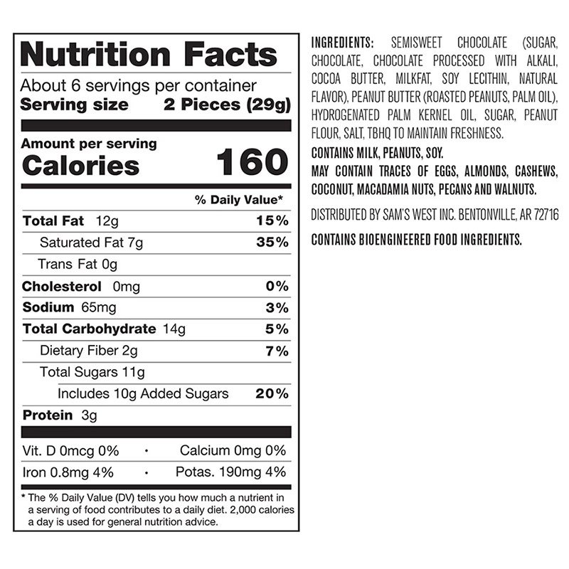 Ingredients: semisweet chocolate (sugar, chocolate, chocolate processed with alkali, cocoa butter, milkfat, soy lecithin, natural flavor), peanut butter (roasted peanuts, palm oil), hydrogenated palm kernel oil, sugar, peanut flour, salt, tBHQ to maintain freshness.