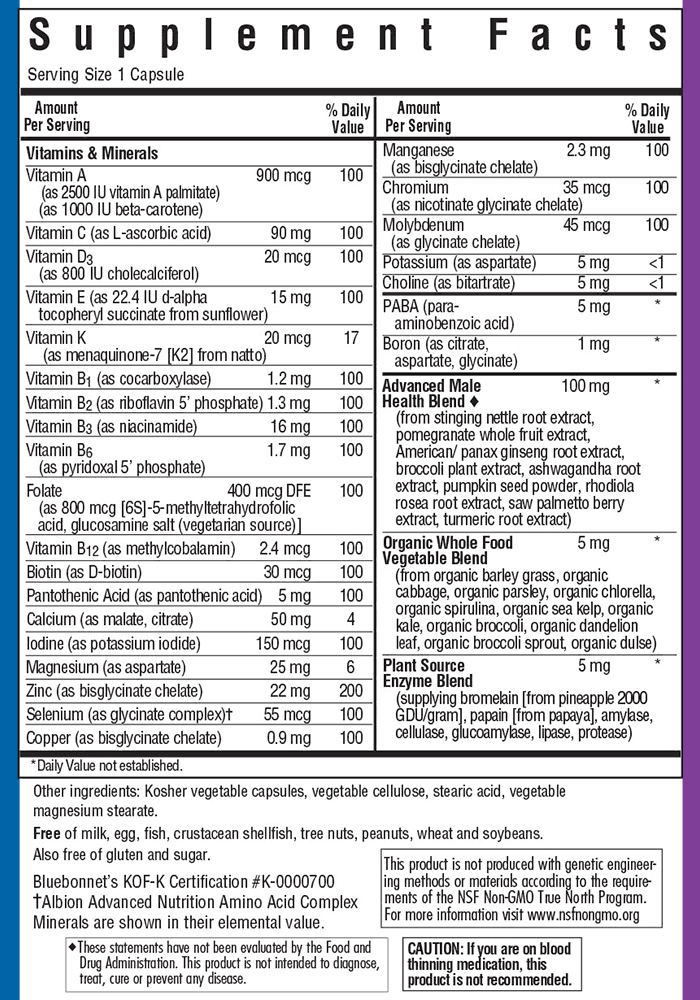 Bluebonnet's Men's ONE are bursting with cutting-edge nutrients at potencies based on current science in conjunction with the most updated recommended daily values (DV), making them the most advanced and wholesome multiples in the natural products marketplace today.