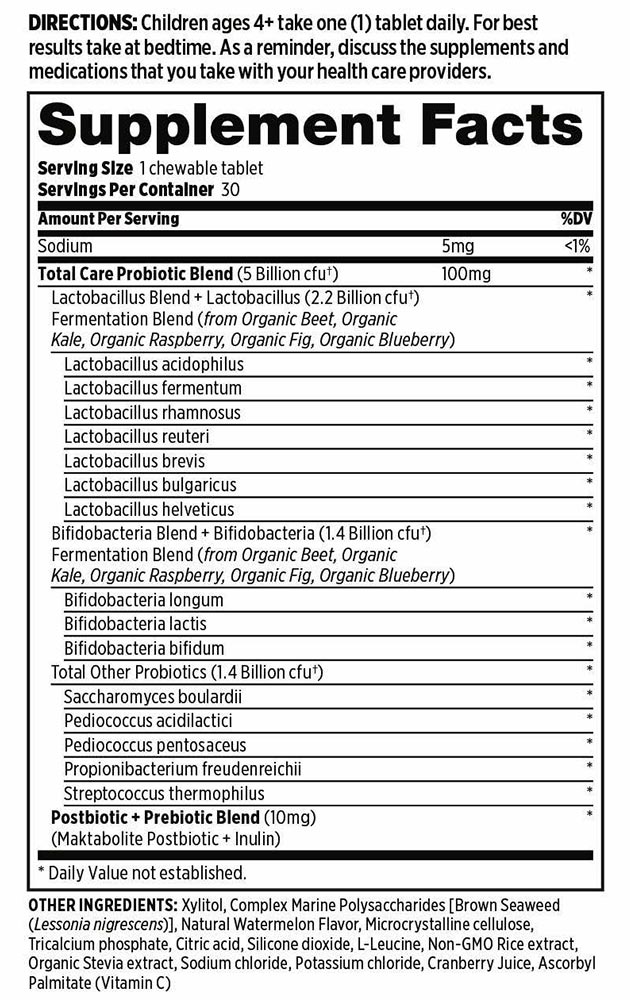 Children over the age of four can take one (1) tablet daily to support their little bellies. For the best results, they can take these fun bug-shaped chewable probiotic tablets before bed. As a reminder, it's always a good idea to discuss supplements and medications your child is taking with a trusted healthcare professional. UPC Code: 855757003473