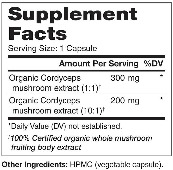 MyPure Cordyceps 4X has the equivalent of 2300 total milligrams of raw Cordyceps militaris powder, or about 4 and a half times more than the 500 mg in a capsule of our MyPureCordyceps. All NonGMO, 100% Certified Organic Mushroom Extract.