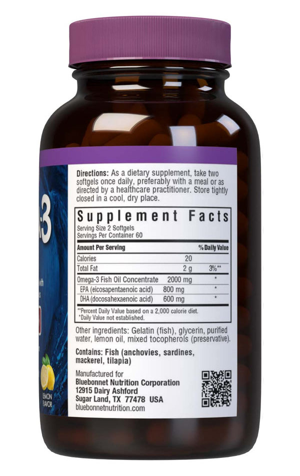 Bluebonnet's Natural Omega-3 Heart Formula Softgels supply EPA and DHA in a ratio scientifically relevant for maintaining cardiovascular health.