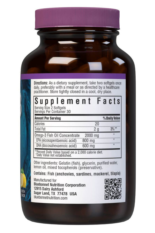 Bluebonnet's Natural Omega-3 Heart Formula Softgels supply EPA and DHA in a ratio scientifically relevant for maintaining cardiovascular health.