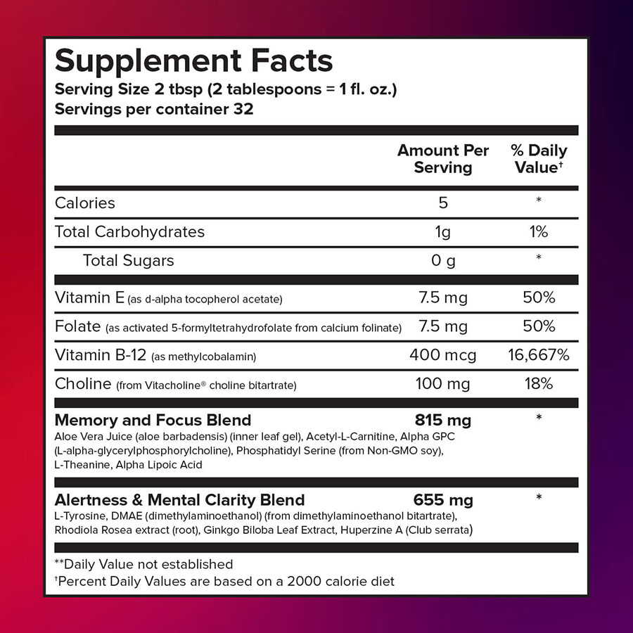 The recommended serving size for Liquid Health NeuroLogic Vitamins for Brain Health is 2 tablespoons (30 ml) per day. You can take it on its own or mix it with your favorite beverage. UPC Code: 765462025366