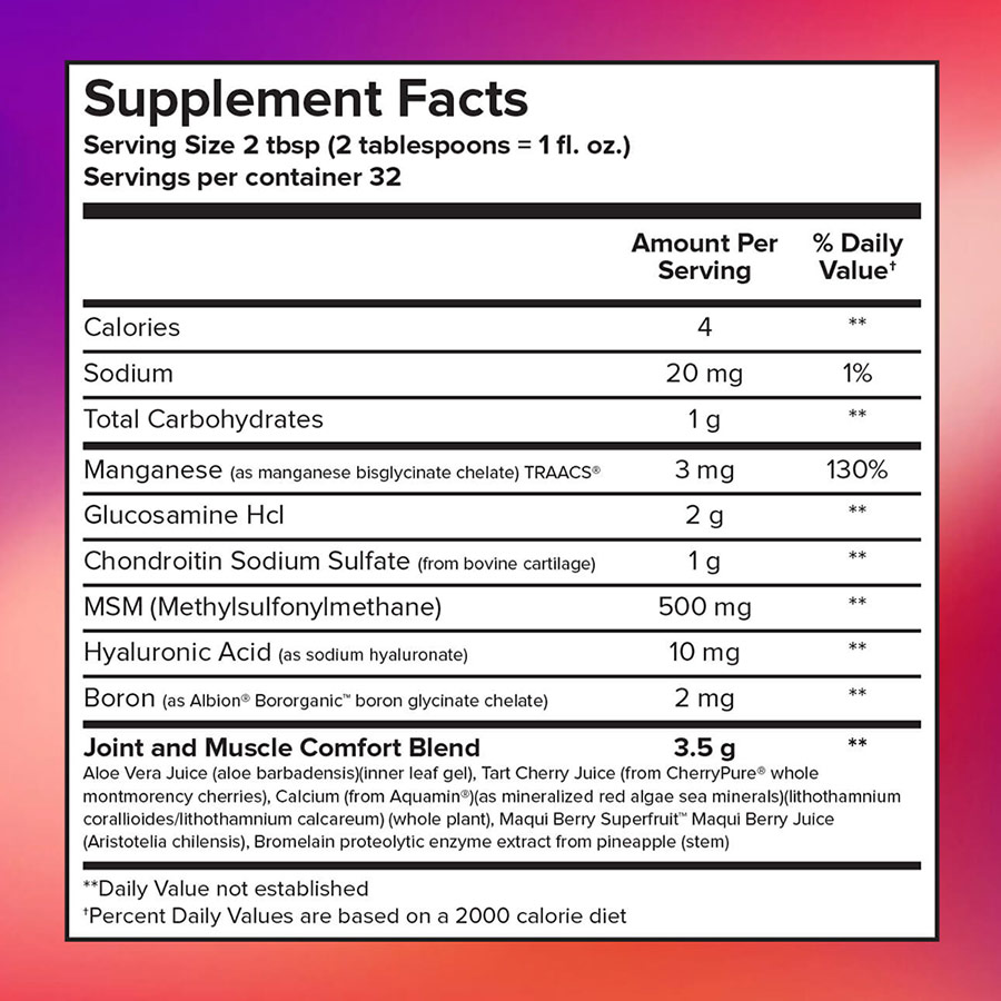The recommended serving size for Liquid Health Optimum Joint is 2 tablespoons (30 ml) per day. You can take it on its own or mix it with your favorite beverage. UPC Code: 765462006327