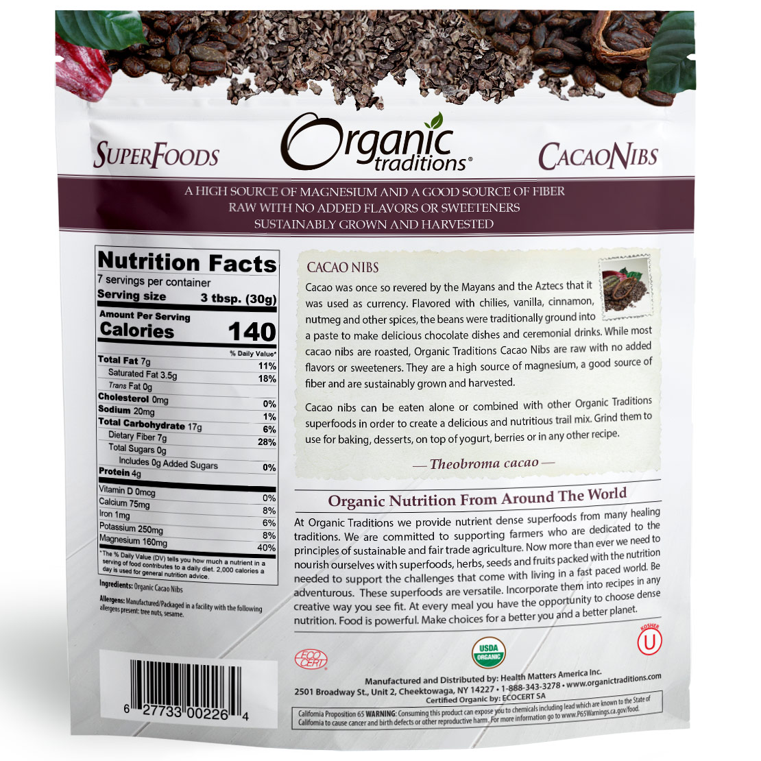 Notice: Individual results may vary. You should always consult with your physician before starting this product or any health-related program. Disclaimer: The product descriptions and the statements on this page are from manufacturers and/or distributors and have not been evaluated by VitaSprings or the FDA. These products are not intended to diagnose, treat, cure, or prevent any disease. VitaSprings does not imply any medical claims from the customer reviews on this Organic Cacao Nibs product on this website. © Organic Traditions