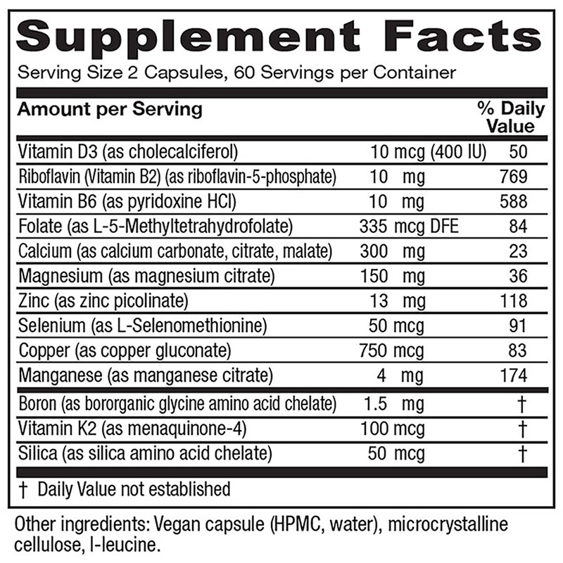 A holistic approach to supporting bone health and integrity with a full complement of supportive vitamins and minerals. Minerals and supporting cofactors are important in maintaining bone health.