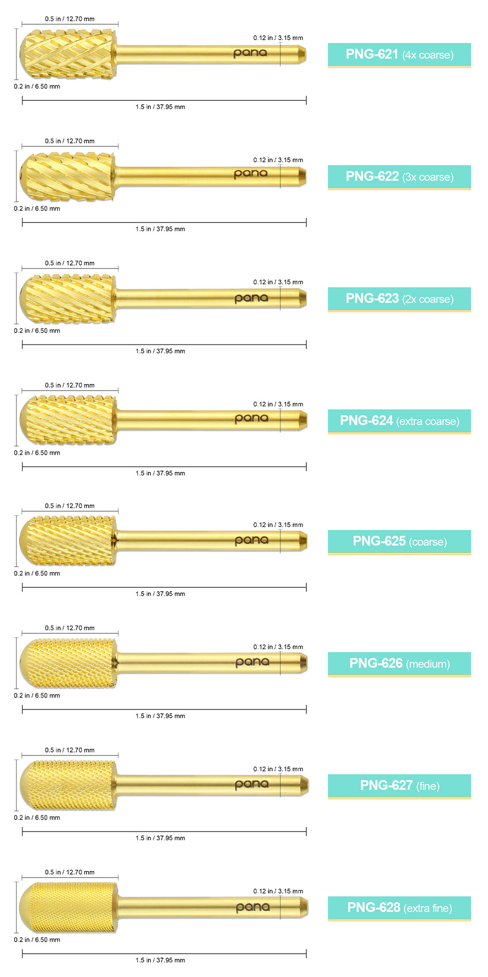The smooth top carbide drill bits are rounded at the top with straight barrels to protect the cuticles and side walls from scratches and cuts upon contact. This carbide drill bit only fits 1/8" shanks for the nail tech's surface coverage preference. The smooth top drill bits also comes in 8 different grit sizes (ranging from extra fine to 4x extra coarse) and 2 different colors (gold and silver). Best for nail techs who are working on artificial nails, the drill bit has many uses: from shaping, carving, smoothing, backfilling, and removing gel.