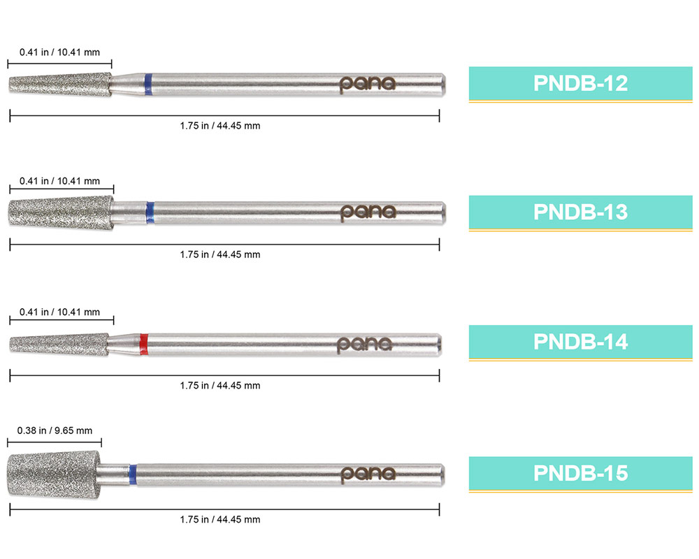 The Diamond Cone Bit allows full flexibility on it's uses for the size of the bit. Pana's Diamond Cone Bit is made of highly graded materials to last longer without rusting or warping. The Diamond Cone Bit is commonly used for removing polish or any remaining products such as glue, or rhinestones, as well as cleaning and carving the cuticle and sidewalls of the nail beds. The cone shaped design of the drill bit allows nail techs to perform detail work at the hard to reach places, such as under the nail, sidewalls, and smaller nail bed surfaces such as toes or pinkie fingers safely with the non-abrasive grit.