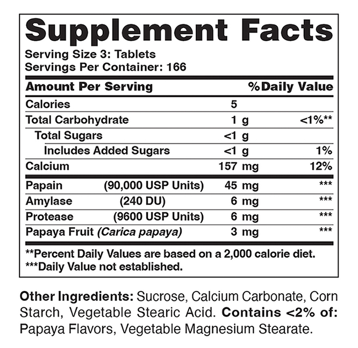 Papaya Enzyme is a chewable enzyme, also known as Papain, that assist in the breakdown of fats and proteins during the digestive process.