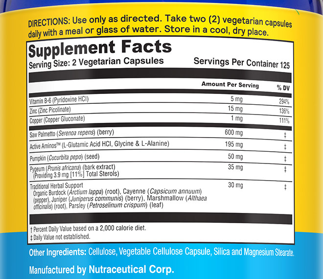 Active Aminos for Active Men - This saw palmetto for men and pygeum supplement for prostate health also packs in 195 mg of our amino acid blend of l-glutamic acid, glycine, and l-alanine - all primary prostate proteins - to help men perform their best. UPC Code: 040647006164